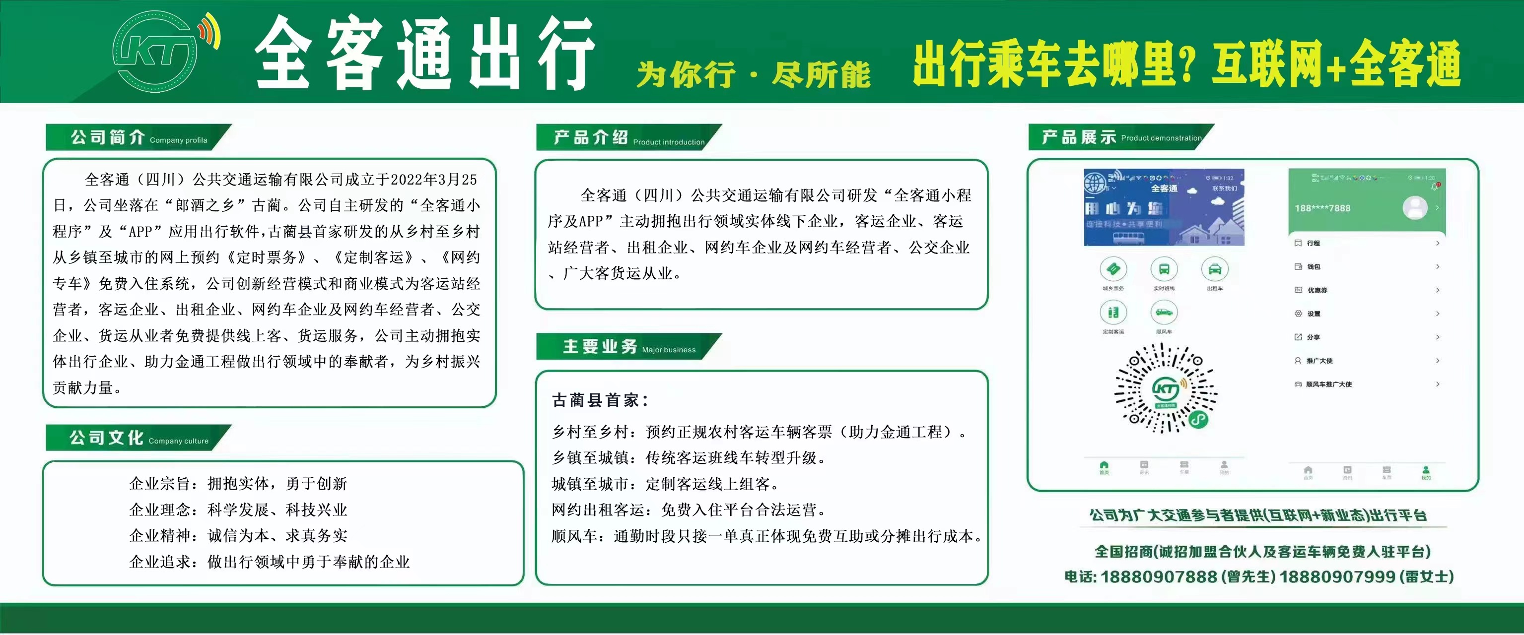 全客通(四川)公共交通运输有限公司成立于2022年3月25日,公司坐落在“郎酒之乡”古蔺。公司自主研发的“全客通出行小程序”及“APP”应用出行软件,古蔺县首家研发的从乡村至乡村、从乡镇至城市的网上预约《定时票务》、《定制客运》、《网约专车》免费入住系统,公司创新经营模式和商业模式为客运站经营者,客运企业、出租企业、网约车企业及网约车经营者、公交企业、货运从业者免费提供线上客、货运服务,公司主动拥抱实体出行企业、助力金通工程做出行领域中的奉献者,为乡村振兴贡献力量