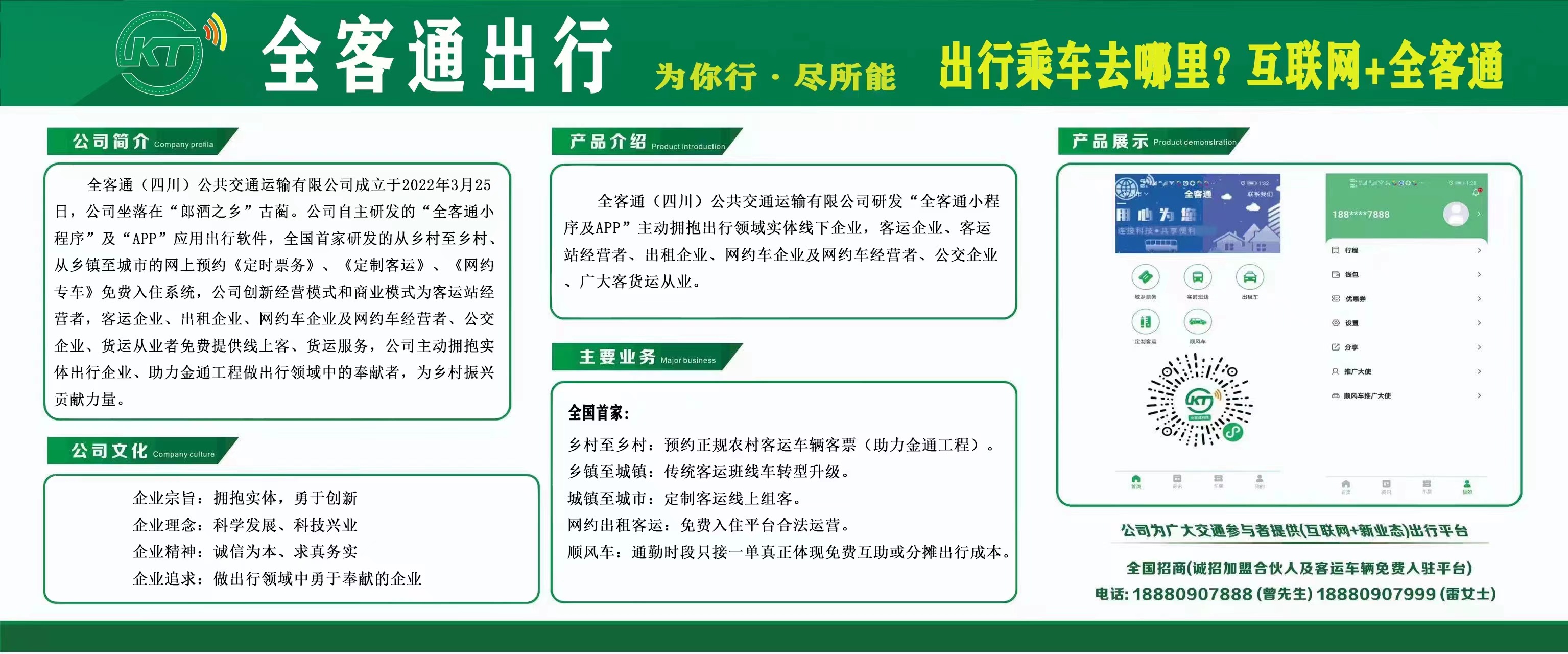 全客通(四川)公共交通运输有限公司成立于2022年3月25日,公司坐落在“郎酒之乡”古蔺。公司自主研发的“全客通小程序”及“APP”应用出行软件,全国首家研发的从乡村至乡村、从乡镇至城市的网上预约《定时票务》、《定制客运》、《网约专车》免费入住系统,公司创新经营模式和商业模式为客运站经营者,客运企业、出租企业、网约车企业及网约车经营者、公交企业、货运从业者免费提供线上客、货运服务,公司主动拥抱实体出行企业、助力金通工程做出行领域中的奉献者,为乡村振兴贡献力量